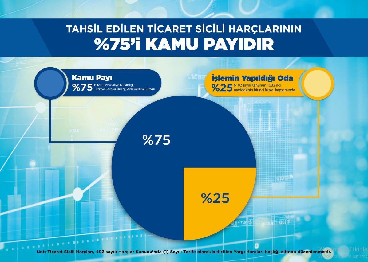 Ticaret sicili işlemlerinde tahsil edilen harçların tamamının Odamızın geliri olduğuna dair yanlış bir algı oluşabilmektedir. Tahsil edilen bu harçların %75'i Kamu Payı (Hazine ve Maliye Bakanlığı vb.) olarak ilgili kurumlara aktarılmakta, hizmetlerin yürütülmesi için yalnızca %25'lik kısmı Odamızda kalmaktadır. Ayrıca bu harç bedelleri Odamızca değil, Hazine ve Maliye Bakanlığı tarafından belirlenmektedir. Üzerinizdeki harç yükünün azaltılması için TOBB nezdinde çalışmalarımız devam etmektedir.