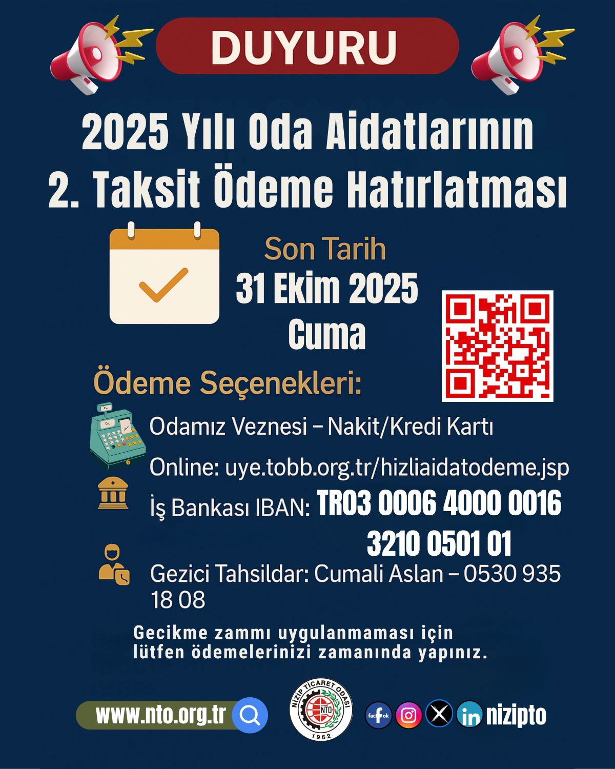 Üyelerimizin mağduriyet yaşamamaları adına, 2025 yılına ait 1. taksit ödemelerini en geç 31 Ekim 2025 Cuma günü mesai bitimine kadar tamamlamaları önemle rica olunur.