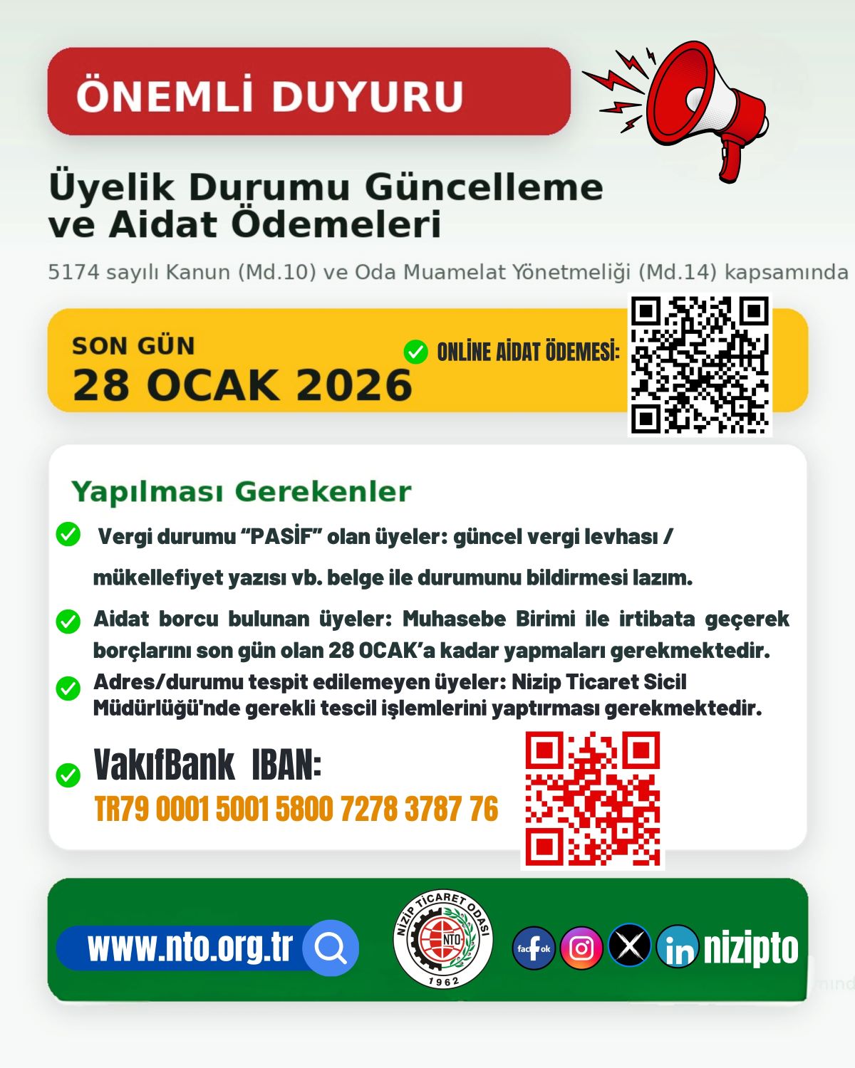 Yukarıda ki durumlara haiz üyelerimizin 28.01.2026 gününe kadar gerekli güncellemeleri ve yasal olan aidat borçlarını ödemeleri gerekmektedir.