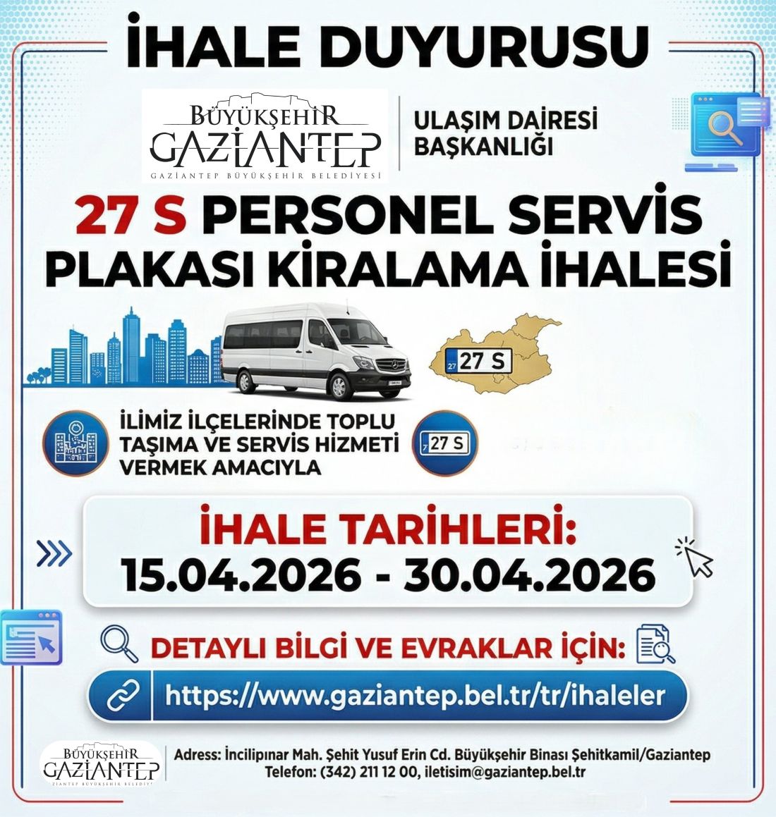 Gaziantep Büyükşehir Belediyesi Ulaşım Dairesi Başkanlığı tarafından, ilçelerimizde personel taşımacılığı (servis) hizmeti veren gerçek ve tüzel kişilere yönelik "S Plaka" kiralama ihalesi düzenlenecektir.
