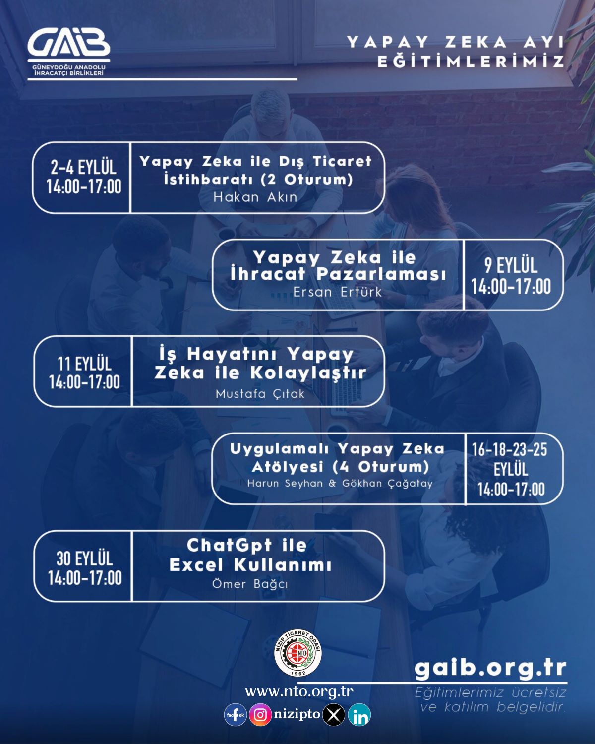 İhracat ve iş dünyasında yapay zekânın sunduğu fırsatların ele alınacağı eğitimler, ZOOM Online Platformu aracılığıyla ücretsiz gerçekleştirilecek olup, katılımcılara eğitim sonunda katılım belgesi verilecektir.